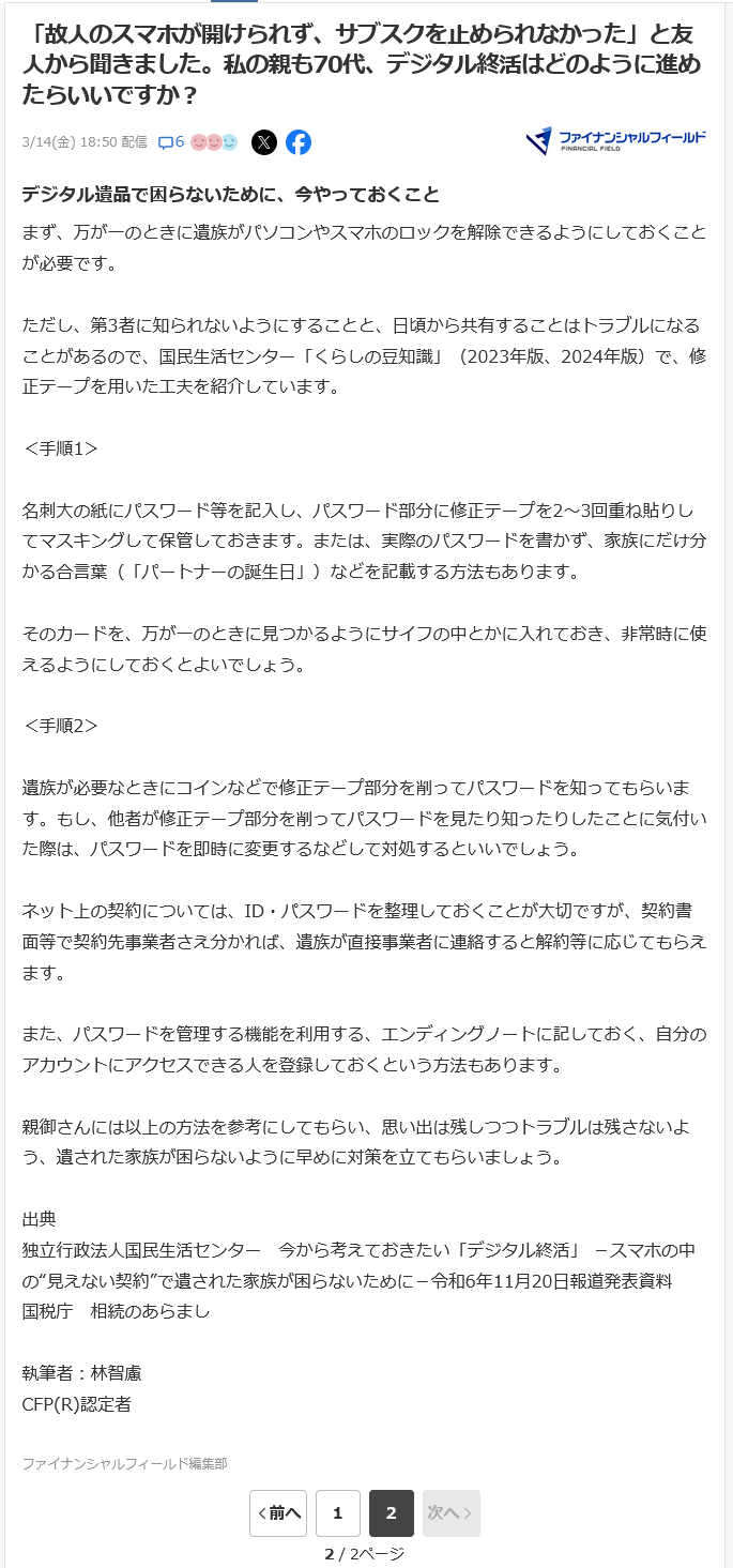 かねてから気になっていた死後についての、デジタル情報管理。偶然にヤフーニュースで見たので、ここに残そう。https://news.yahoo.co.jp/articles/98e275e56b94ad9c24d13a83ae39b12ee8bacfa2?page=2