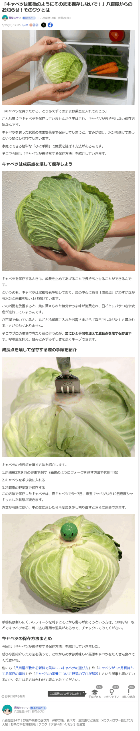 「キャベツは画像のようにそのまま保存しないで!」八百屋からのお知らせ!そのワケとは