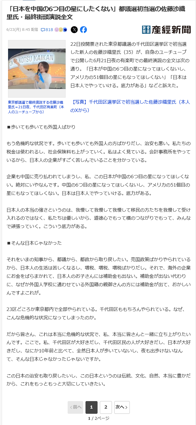 22日投開票された東京都議選の千代田区選挙区で初当選した新人の佐藤沙織里氏(35)が、自身のユーチューブで公開した6月21日夜の有楽町での最終演説の全文は次の通り。「日本が中国の6つ目の星になってほしくないし、アメリカの51個目の星にもなってほしくない」「日本は日本人でやっていける。底力がある」などと訴えた。